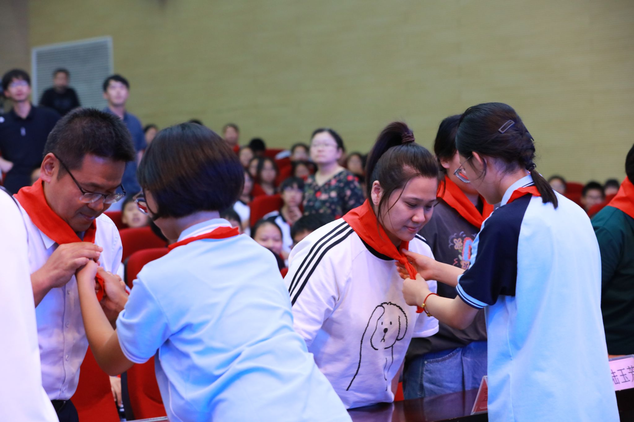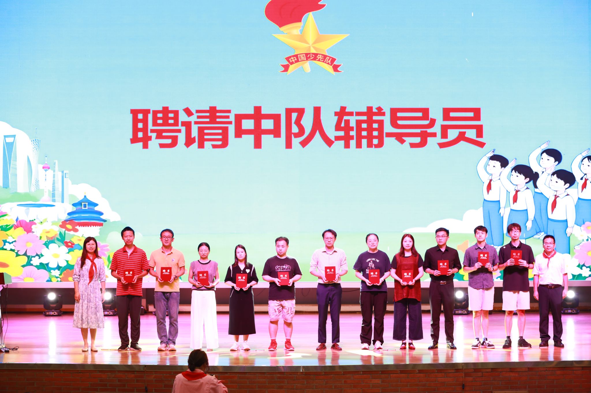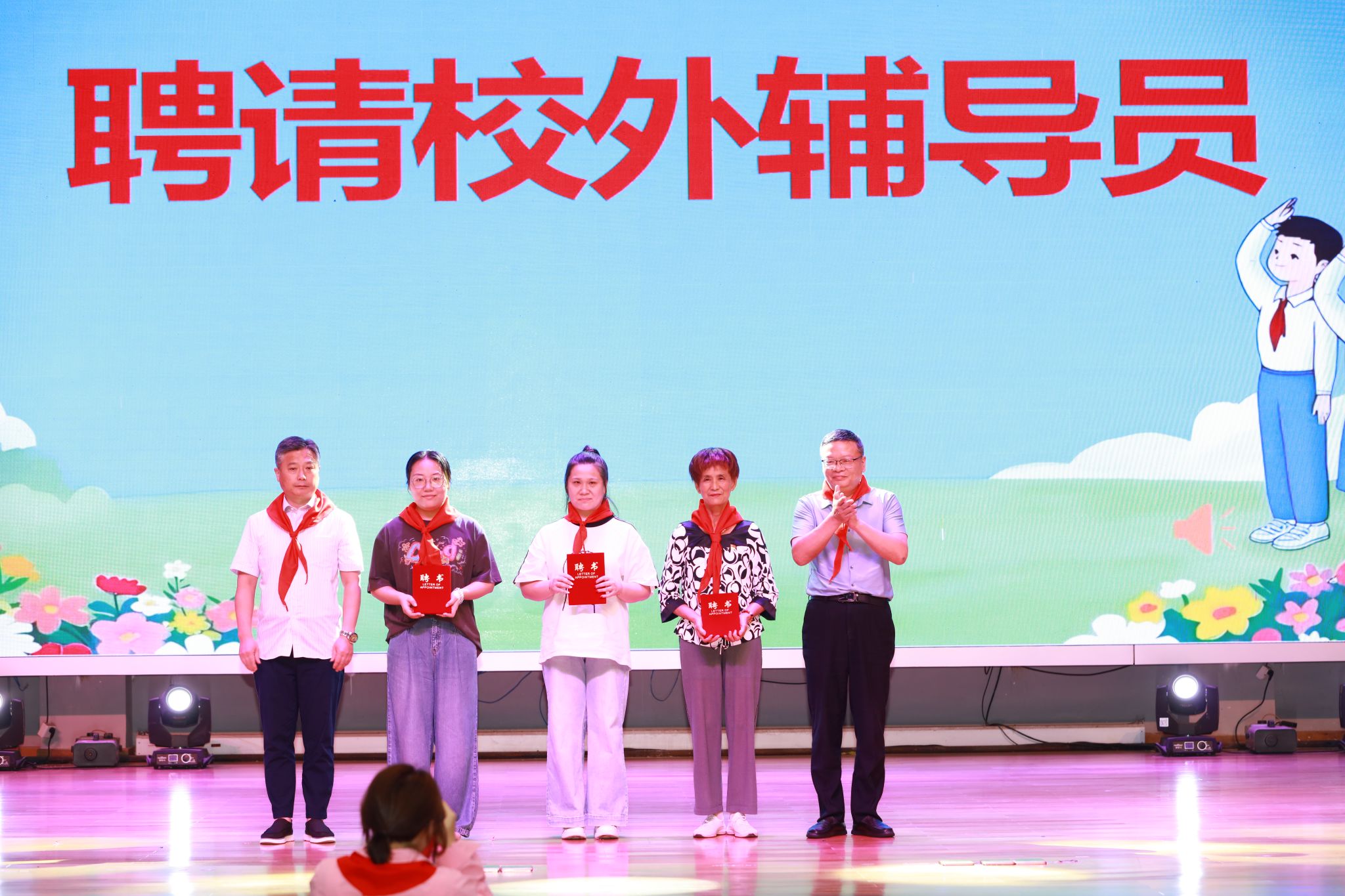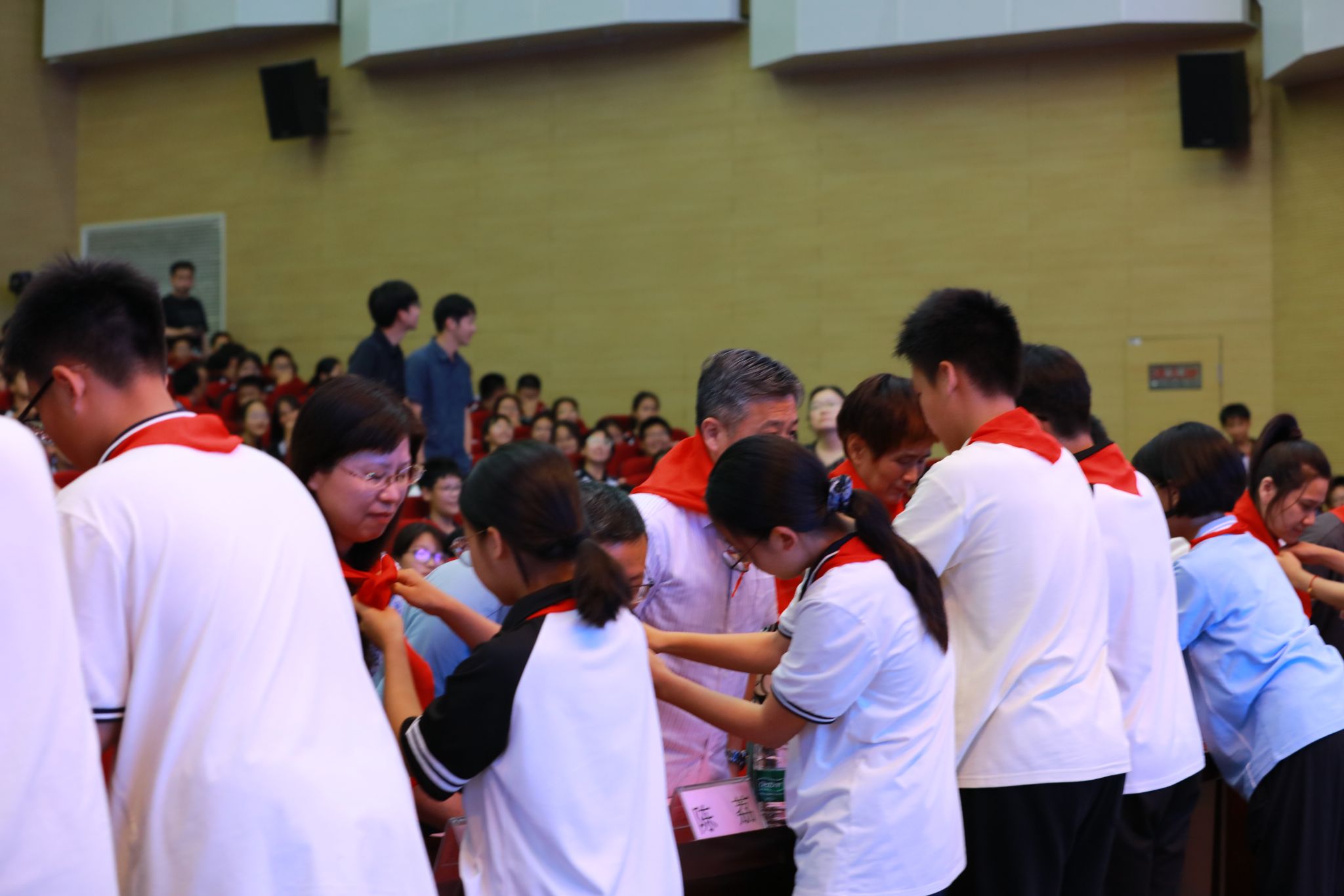 为增强少先队工作的专业力量,活动现场举行了聘任仪式。陈荔书记宣读校外辅导员聘任决定,并为相关嘉宾颁发聘书;杨喆毅校长宣读中队辅导员聘任决定,并与张竹慧副校长共同为12位初一中队辅导员颁发聘书。12名中队长代表上台为辅导员敬献红领巾,红色纽带连接起师生共同的责任与担当。