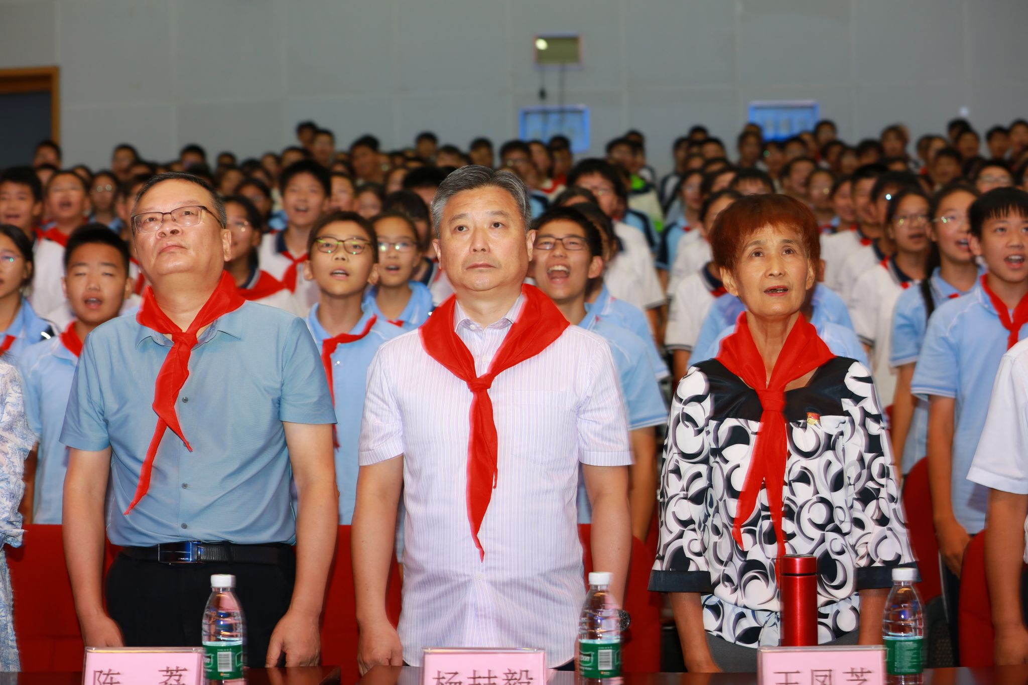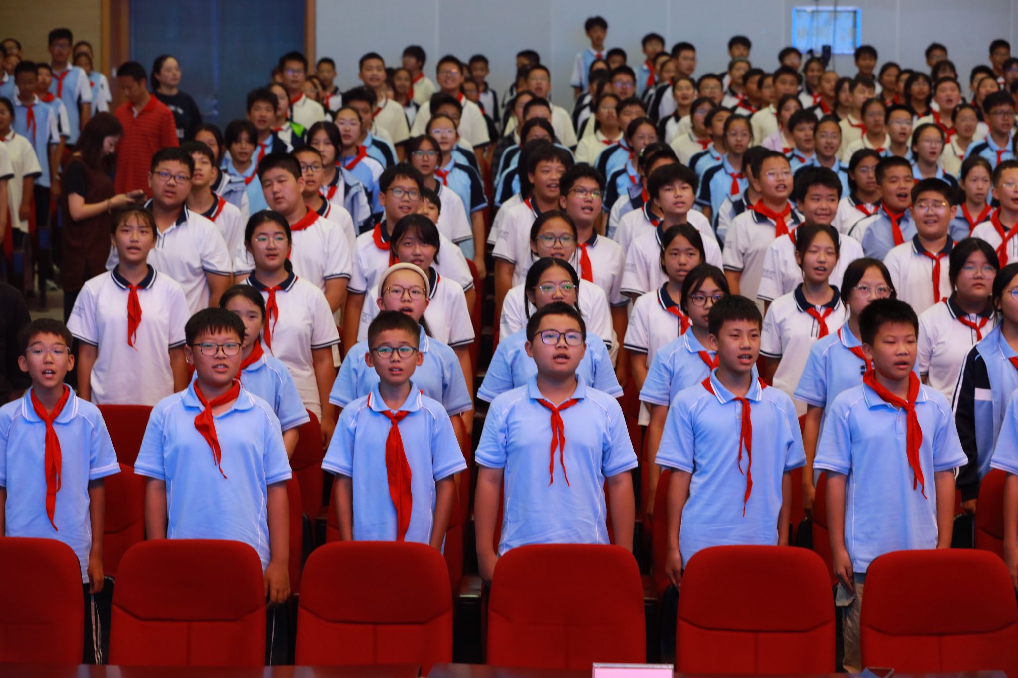 激昂的《出旗曲》奏响,旗手们迈着坚定步伐护送队旗入场,全体少先队员肃立敬礼。礼毕后,《我们是共产主义接班人》的旋律响起,师生齐声高唱,嘹亮歌声中饱含“强国复兴有我”的坚定信念。